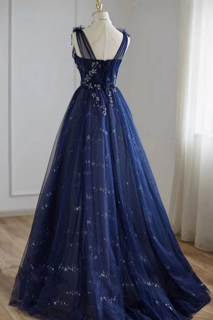 A Line Navy blue Tulle Beaded V Neckline Party Dress, Navy Blue Shiny Tulle Prom Dress fg5369