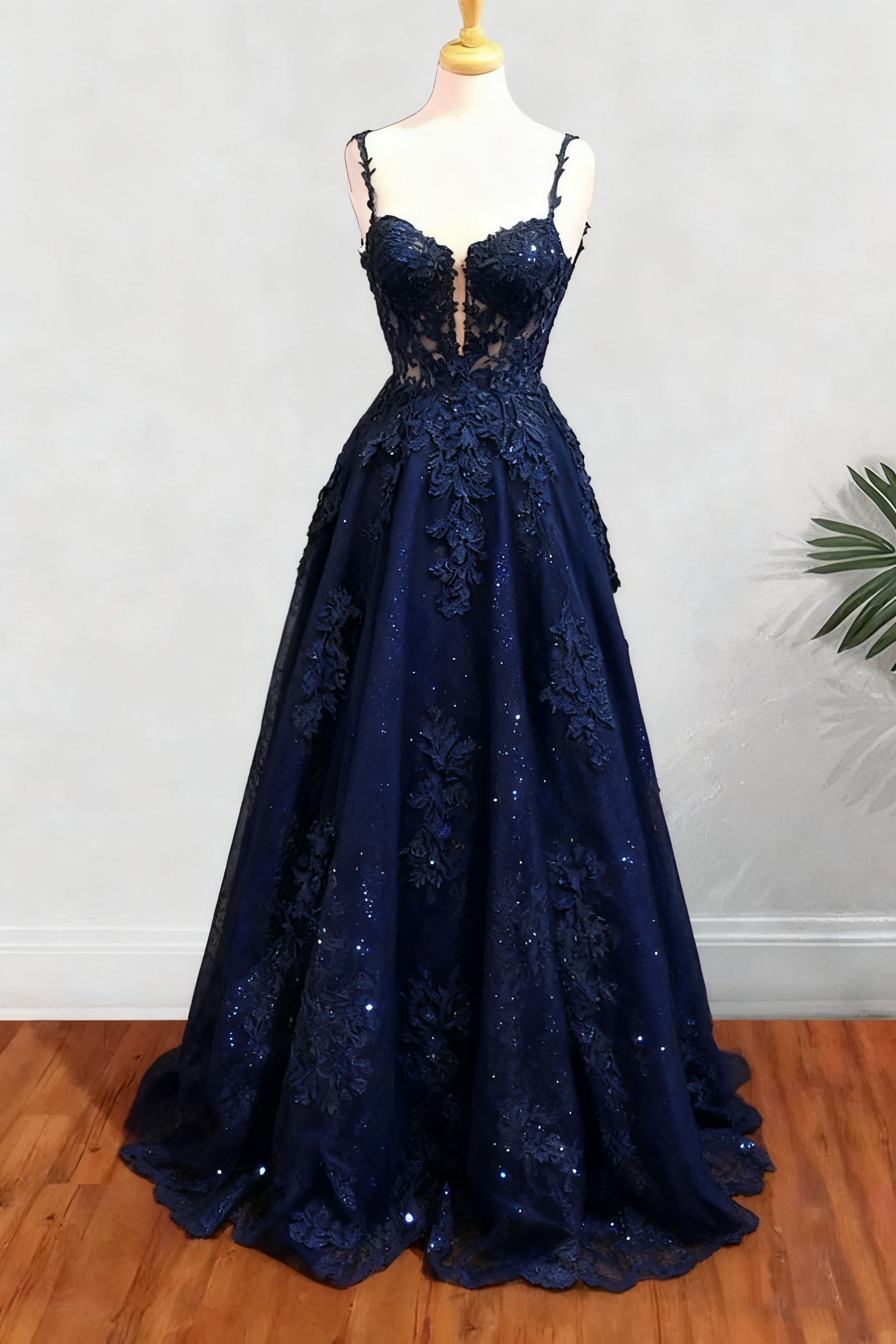 A-line Spaghetti Straps Long/Floor-Length Tulle Prom Dress With Beading Glitter Appliqued fg6754