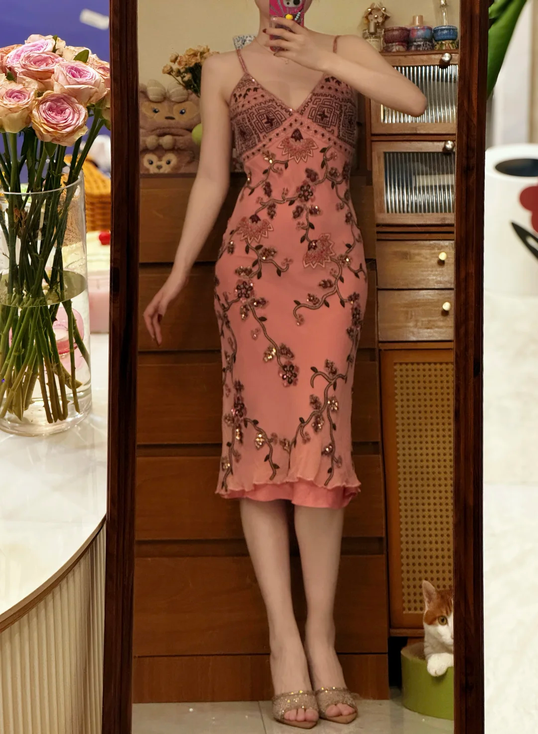 Beaded Vintage Midi Evening Dress Birthday Outfit Prom Dress fg8279