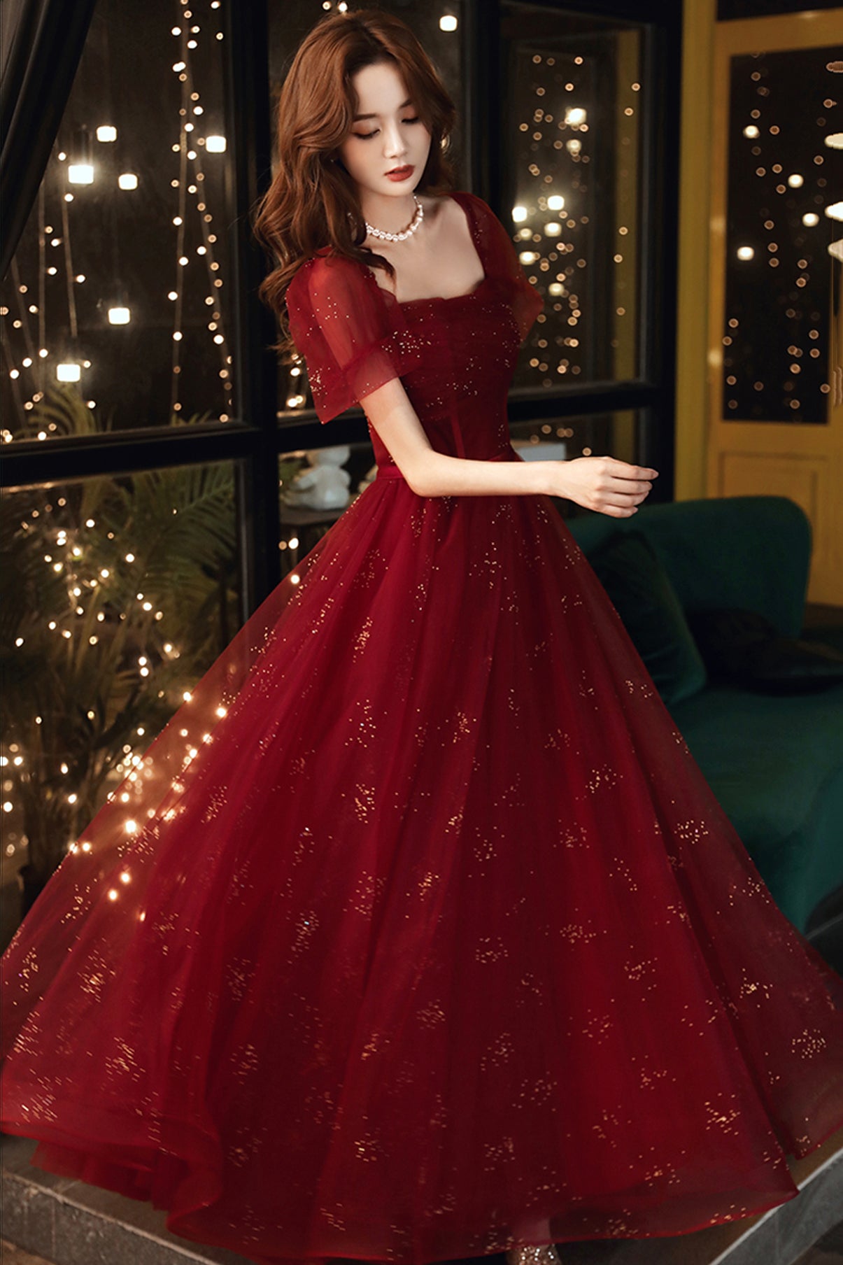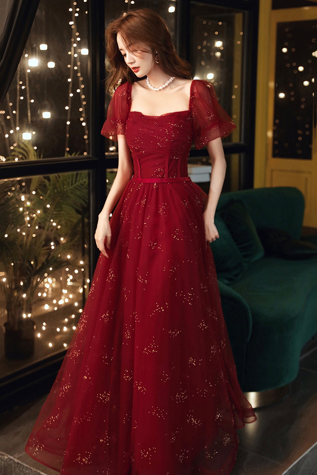 Burgundy Tulle Sequins Long A Line Prom Dress Evening Dress fg4234