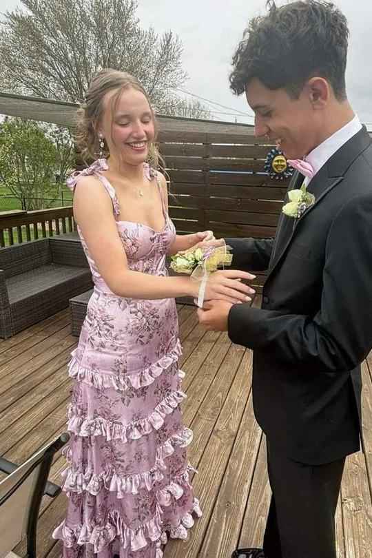 Elegant Double Straps Print Sleeveless Ruffles Prom Dress with Slit fg8303
