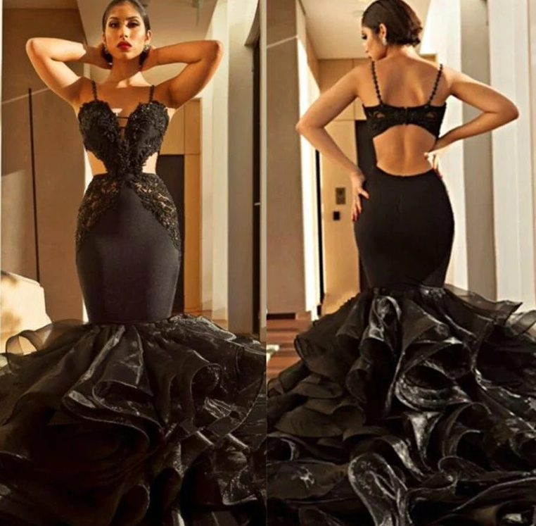 Glamorous Black Spaghetti-Straps Mermaid Prom Dresss Lace Appliques With Ruffles fg1587