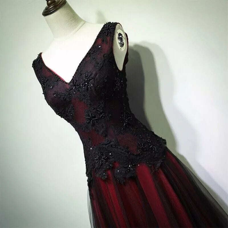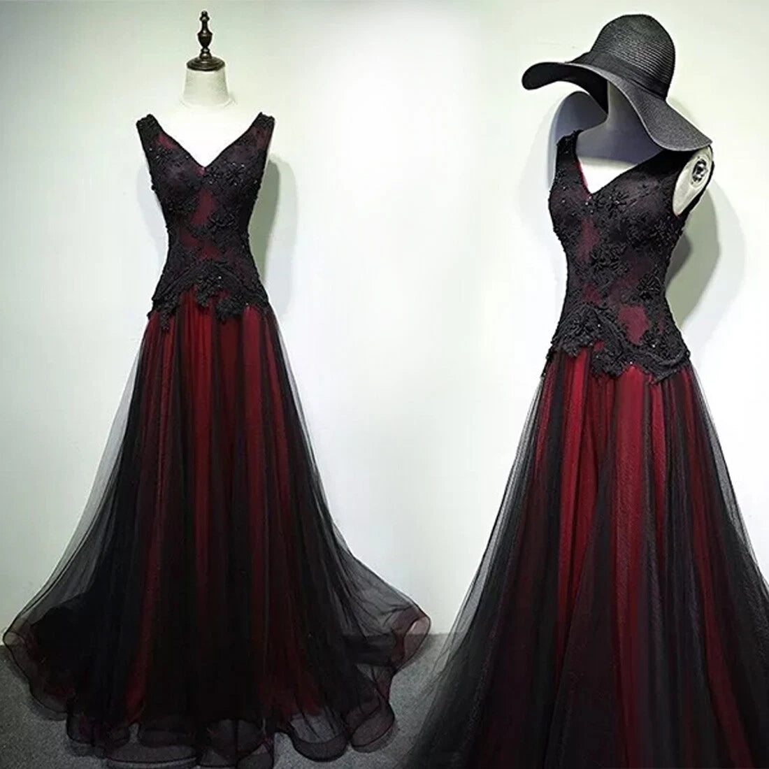 Gorgeous Black And Red V-Neckline Tulle Beaded Prom Dress, Long Evening Gown fg1880