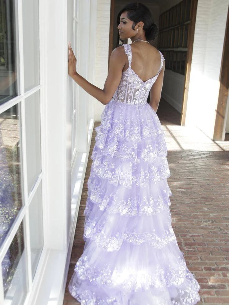 Lilac Sequin Lace Ruffles Prom Dress Split Evening Gown fg5109