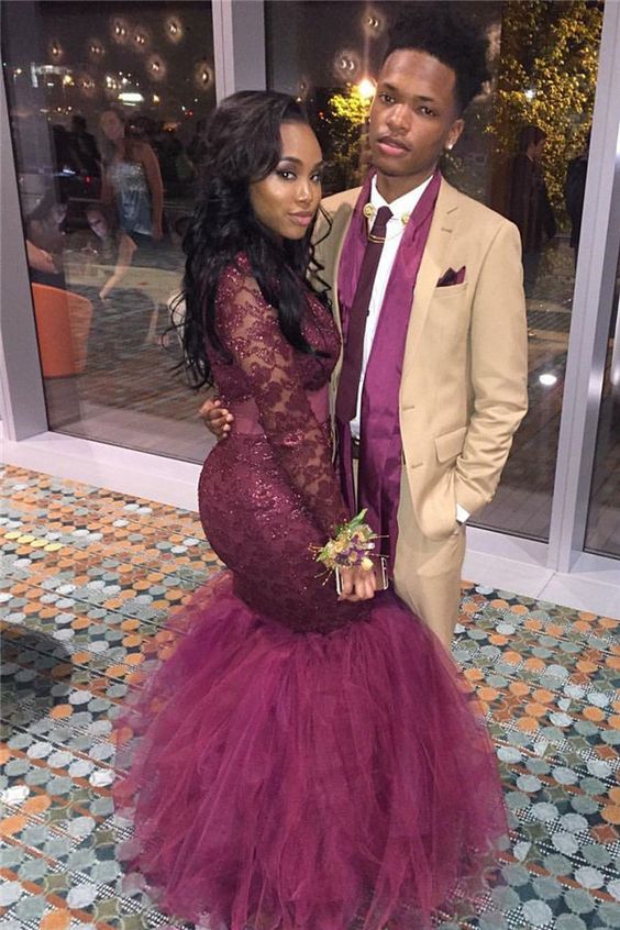 Tulle Mermaid Lace-Appliques Long-Sleeve Prom Dress | Plus Size Prom Dress fg2299