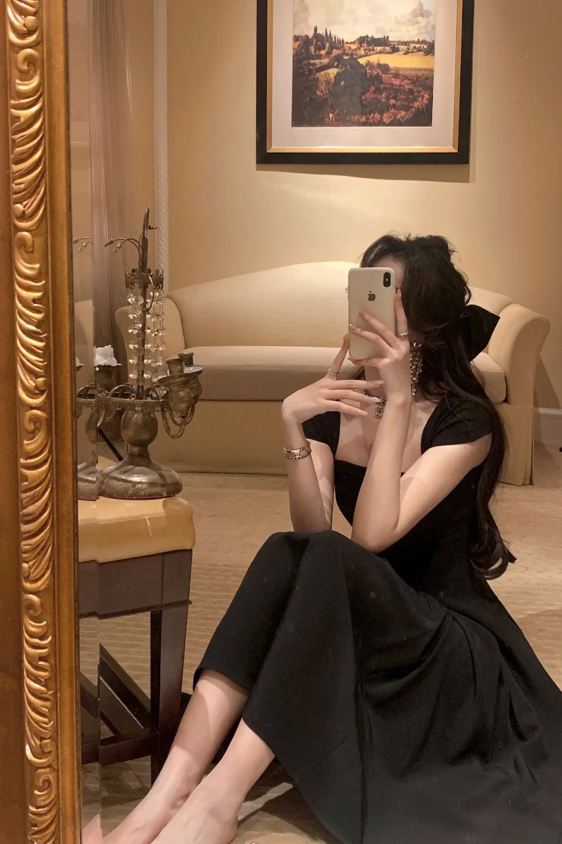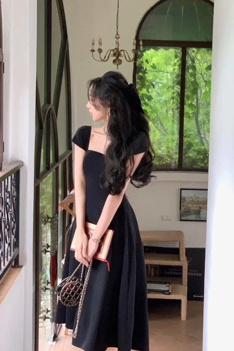 White summer dress women chic elegant square neck evening birthday party midi dress fg6023